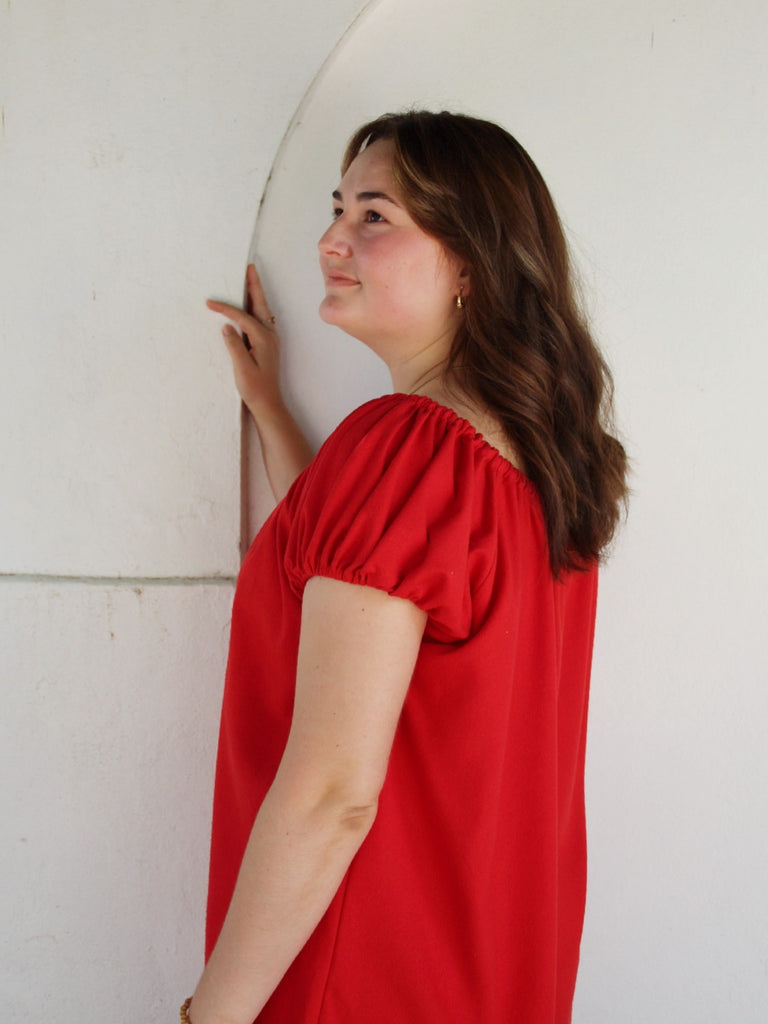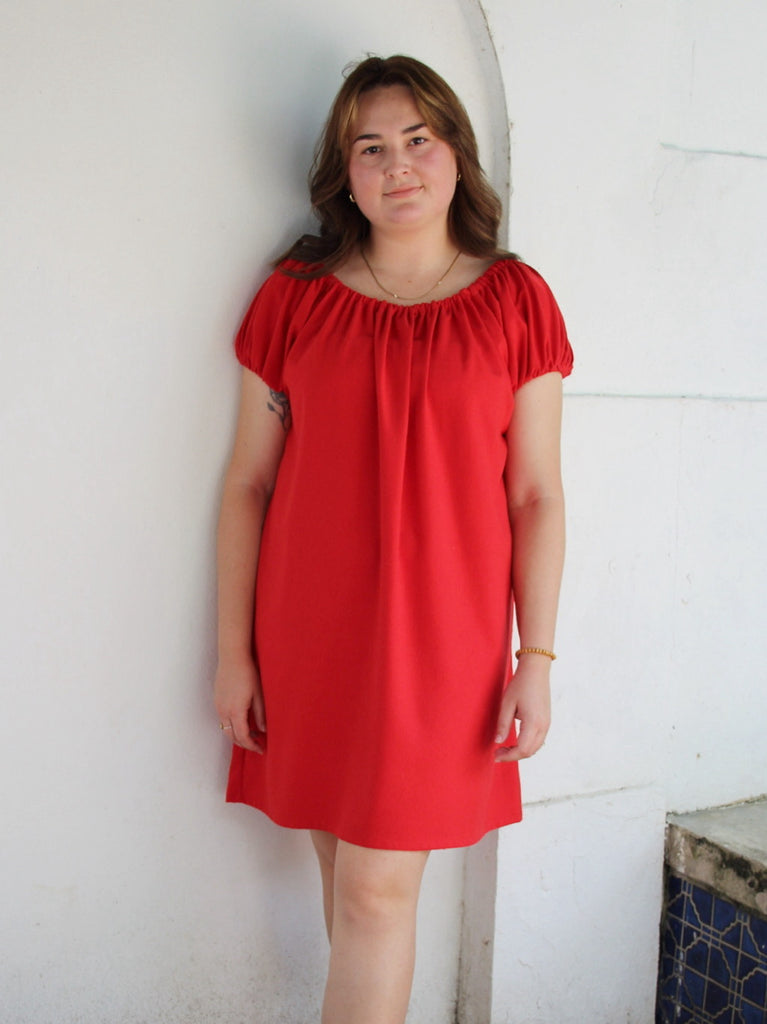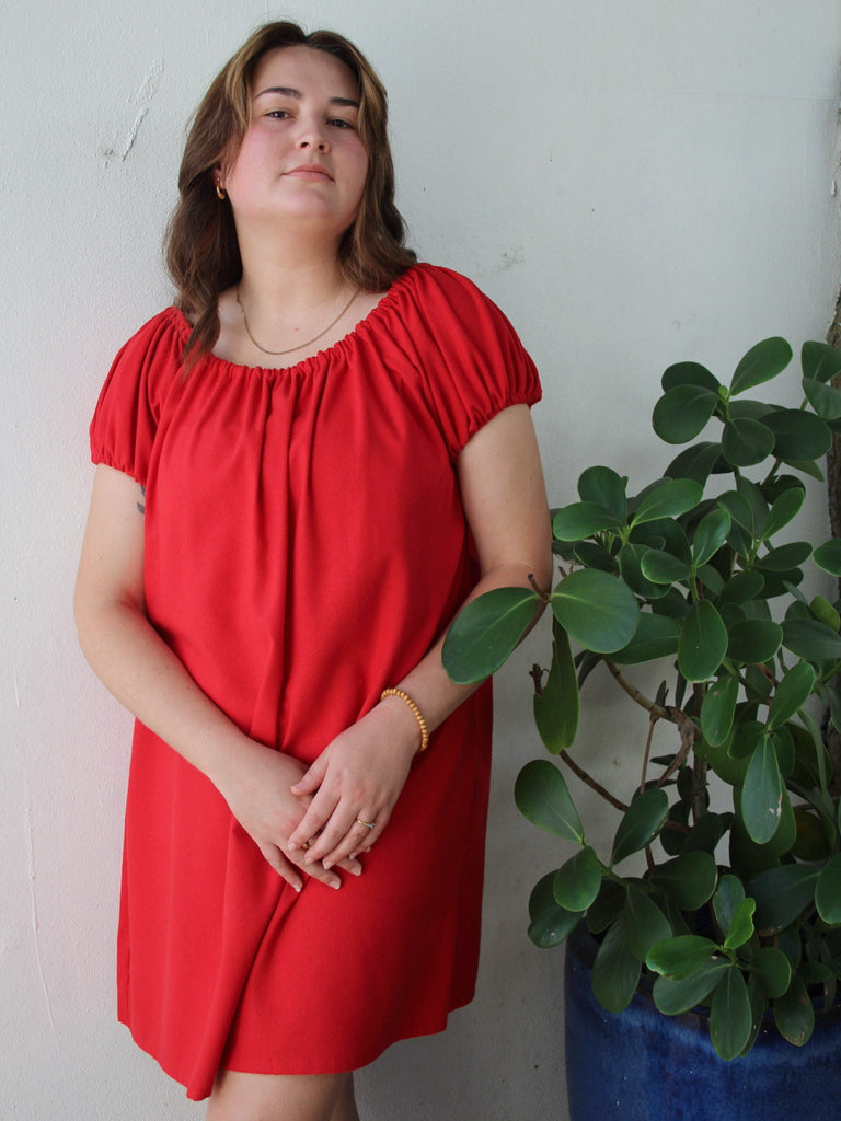 Above the knee length. Elastic around neckline, and sleeves. Slightly wider at bottom for extra volume.